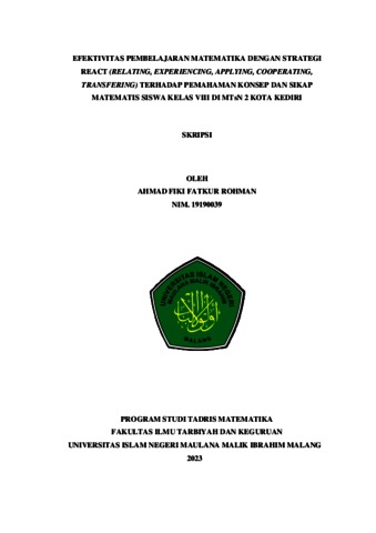 Rohman, Ahmad Fiki Fatkur (2023) Efektivitas pembelajaran Matematika dengan strategi REACT (Relating, Experiencing, Applying, Cooperating, Transfering) terhadap pemahaman konsep dan sikap matematis siswa Kelas VIII di MTsN 2 Kota Kediri. Undergraduate thesis, Universitas Islam Negeri Maulana Malik Ibrahim.