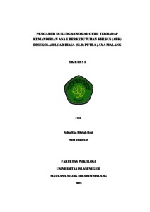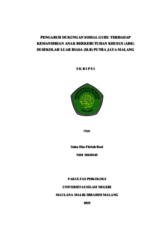 Rozi, Salsa Eka Fitriah (2025) Pengaruh dukungan sosial guru terhadap kemandirian Anak Berkebutuhan Khusus (ABK) di Sekolah Luar Biasa (SLB) Putra Jaya Malang. Undergraduate thesis, Universitas Islam Negeri Maulana Malik Ibrahim.