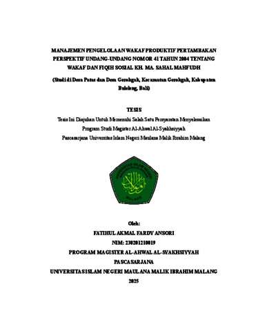 Ansori, Fatihul Akmal Fardy (2025) Manajemen pengelolaan wakaf produktif pertambakan perspektif Undang-Undang Nomor 41 Tahun 2004 tentang wakaf dan fiqih sosial KH. MA. Sahal Mahfudh: Studi di Desa Patas dan Desa Gerokgak Kecamatan Gerokgak Kabupaten Buleleng Bali. Masters thesis, Universitas Islam Negeri Maulana Malik Ibrahim.