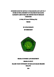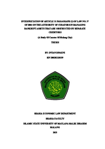 Isnaeni, Intan (2025) interpretation of article 31 paragraph (1) of law no. 37 of 2004 on the authority of curators in managing bankrupt assets that are obstructed by separate creditors: A study of curator of Malang City. Undergraduate thesis, Universitas Islam Negeri Maulana Malik Ibrahim.