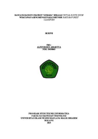 Amartya, Alfin Rizky (2023) Rancang bangun Chatbot Gumara sebagai Virtual Route Guide wisatawan asing menggunakan metode Random Forest Classifier. Undergraduate thesis, Universitas Islam Negeri Maulana Malik Ibrahim.