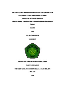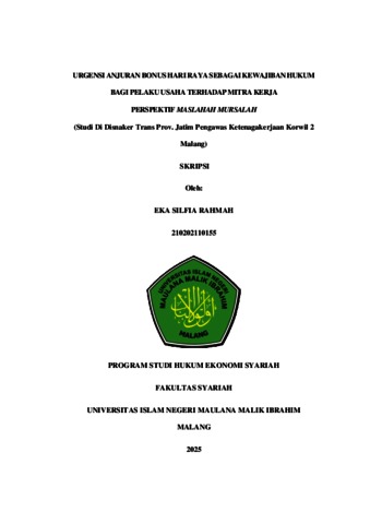 Rahmah, Eka Silfia (2025) Urgensi anjuran bonus hari raya sebagai kewajiban hukum bagi pelaku usaha terhadap mitra kerja perspektif Maslahah Mursalah: Studi di Disnaker Trans Prov. Jatim Pengawas Ketenagakerjaan Korwil 2 Malang. Undergraduate thesis, Universitas Islam Negeri Maulana Malik Ibrahim.