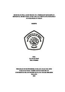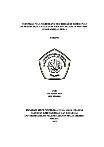 Putri, Lia Novian (2025) Hubungan pola asuh orang tua terhadap kemampuan mengenal huruf pada anak usia 5-6 tahun di TK Muslimat NU 04 Bangilan Tuban. Undergraduate thesis, Universitas Islam Negeri Maulana Malik Ibrahim.