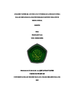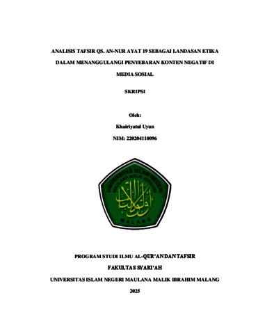 Uyun, Khairiyatul (2025) Analisis tafsir QS. An-Nur ayat 19 sebagai landasan etika dalam menanggulangi penyebaran konten negatif di media sosial. Undergraduate thesis, Universitas Islam Negeri Maulana Malik Ibrahim.