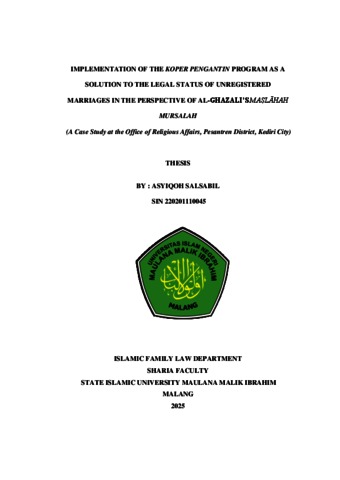 Salsabil, Asyiqoh (2025) Implementation of the Koper Pengantin Program as a solution to the legal status of Unregistered Marriages in the Perspective of Al-Ghazali’s Maslāhah Mursalah : A Case Study at the Office of Religious Affairs, Pesantren District, Kediri City. Undergraduate thesis, Universitas Islam Negeri Maulana Malik Ibrahim.