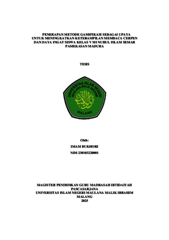 Bukhori, Imam (2025) Penerapan metode gamifikasi sebagai upaya untuk meningkatkan keterampilan membaca cerpen dan daya ingat siswa kelas V MI Nurul Islam Semar Pamekasan Madura. Masters thesis, Universitas Islam Negeri Maulana Malik Ibrahim.
